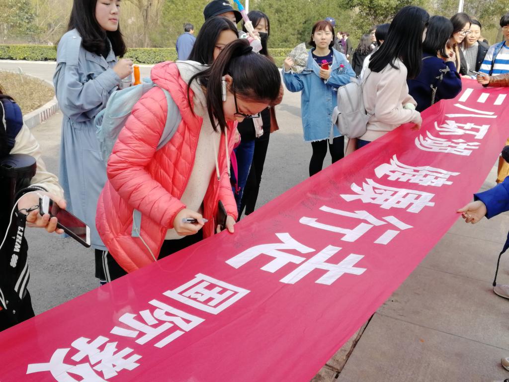 活动开始前,党支部书记米启超做了动员讲话,给大家讲解了“三八国际劳动妇女节”的发展历程,描述了当时为了维护女权主义国际上的贡献和为了争取妇女权利作出的斗争。然后活动正式开始,一路上大家欢声笑语,洋溢在春天的气氛中。有了职工的加入,大家相互交流的兴致更加浓郁了。健步走活动结束后,职工大山表示,这次活动让他感到十分开心,并且白龟湖湿地公园边的春景也十分优美。最后太阳集团tyc4633所有女性教师及同学在横幅上签名留念。